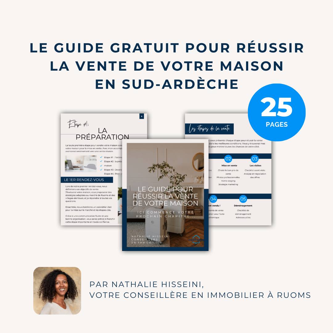Ce guide offert vous explique, étape par étape, comment réussir la vente de votre maison à Ruoms et en sud Ardèche. Vous découvrirez comment préparer votre bien pour séduire les acheteurs, éviter les erreurs qui coûtent cher, mettre en valeur ses atouts dans une annonce percutante et attirer les bons acquéreurs. Vous y trouverez aussi mon plan marketing exclusif et une checklist pratique pour aborder votre déménagement l’esprit léger. En bref, tout ce qu’il faut pour vendre vite, bien et sereinement.